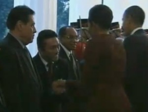 Luckily, the Associated Press caught the First Lady’s salutory siege on video. Did Sembiring try to fend off the greeting, or is this just so much hand jive? (h/t Alan Colmes)