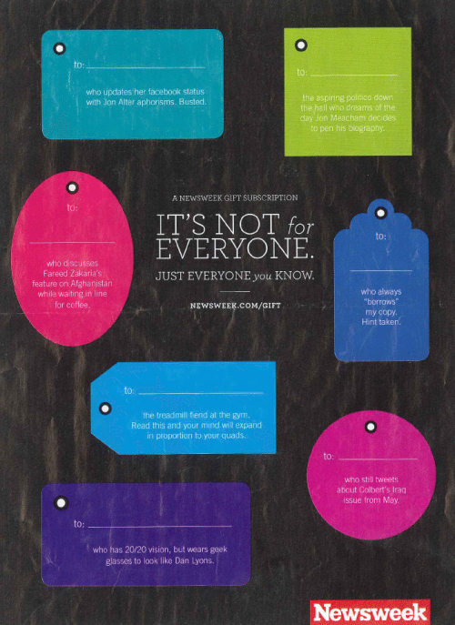 Whether Newsweek wants to admit this didn’t matter – their ad this week for Newsweek.com/Gift, hoping their print readers sign their friends up for the magazine, is a clear indication of their mindstate. Here it is, then let’s talk about it: