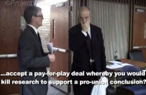 O’Keefe specifically alleges that the Rutgers professor offered to kill “an economic study in a pay-for-play deal in order to defeat SB5,” which is an Ohio anti-collective bargaining bill. The video depicts a conversation that appears to support this allegation, which Keefe later defends to Christian Hartsock, a partner of O’Keefe’s in Project Veritas. While the video looks damning, given O’Keefe’s track-record of questionable editing (regarding his initial Pimp/ACORN stunt and his NPR funding scam), a healthy dose skepticism is never a bad idea.