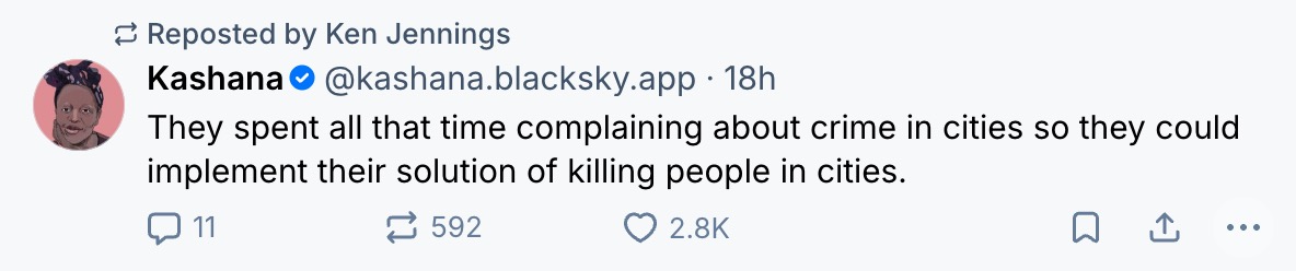 Moments earlier, Jennings had amplified a post from writer Kashana Cauley, who wrote: “They spent all that time complaining about crime in cities so they could implement their solution of killing people in cities.”