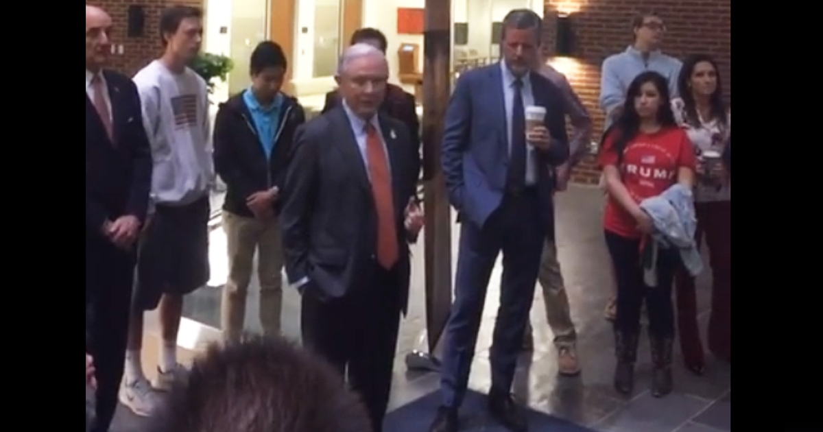 “Strangely,” he says. At the time, Sessions was a top Trump supporter and a major face of the campaign. He was among the first of the prominent Republicans to endorse Trump. He was stumping for Trump on that bus tour. The campaign considered evangelicals, correctly, to be one of their core bases of support. Stopping at Liberty was an endorsement of the University as a leading evangelical platform. Why would him stopping by be strange? What exactly is strange about it?