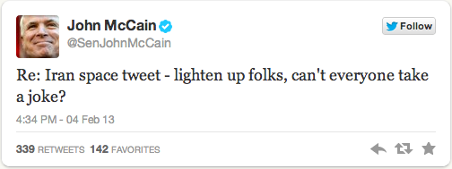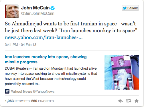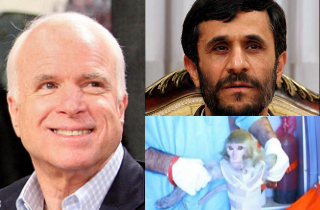 Responding to the news that Ahmadinejad declared himself “ready to be the first human to be sent to space by Iranian scientists,” Sen. McCain tweeted out a link to last week’s story about Iran reportedly launching a monkey into space:
