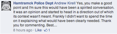 Catch that? “Society is far more violent than it has ever been, period!” Some pretty factually illiterate nonsense from a person in charge of law enforcement (and the safety) of a small town of 20,000+ people. He later claimed I had simply taken him out of context, and after some more back-and-forth, gave this final backpedal:
