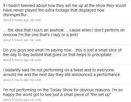 Early this morning, Kanye West said on Twitter that he would not be performing on Today. “I’m not performing on the Today Show for obvious reasons. I’m so happy the world got to see just a small piece of ‘the set up’,” he tweeted.