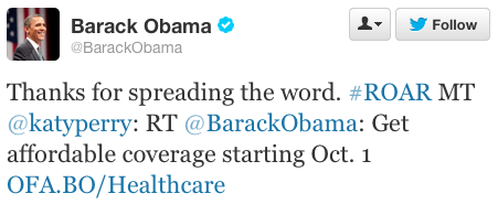 Perry’s political activism hasn’t gone unnoticed by the president, as during the MTV VMAs this year, after she retweeted a message about Obamacare to her millions of followers, Obama’s Twitter account actually replied with this.