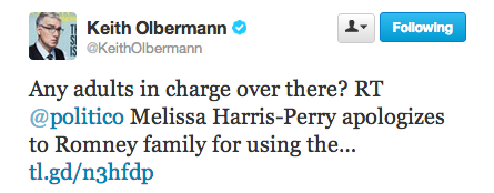 This all concerns Melissa Harris-Perry’s apology Tuesday morning for a Sunday segment in which panelists on her show mocked a Romney family photo over Mitt Romney’s adopted African-American grandson. The Harris-Perry flare-up comes on the heels of the Martin Bashir and Alec Baldwin controversies, which resulted in both men leaving the network.