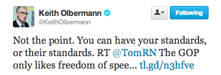 Responding to one reply, that the GOP “only likes freedom of speech when it applies to them…otherwise they CRY like babies,” Olbermann tweeted: