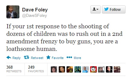 Foley was arguably painting with too broad a brush, even with his specific reference to “your first response.” There were, undoubtedly, many people who rushed out to buy guns out of a sincere, if irrational and misguided, desire to protect themselves from such horrors, and others who acted out of a sincere, if irrational, anxiety that the government might severely restrict gun ownership as a result of the tragedy, and if either of those was your first reaction, maybe you’re not a “loathsome human,” but you’ve got perspective issues.