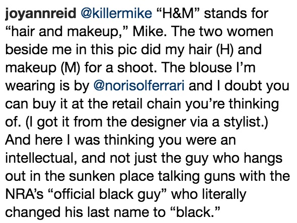 There was just one teeny tiny problem. Reid was not talking about the company H&M. She was talking about hair and makeup, and called Killer Mike out for the very incorrect comment: