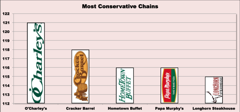 Interesting fact: Of the top five above, O’Charley’s also had an above-average liberal index (108).