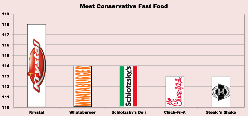 The survey, flagged by The Wall Street Journal, scores fast food joints, restaurant chains, and supermarkets based on their customers’ political preferences. A 100 indicates average politics while, say, an 80 score indicates 20% less conservative or liberal than average; and a 120 score indicates 20% more than average.