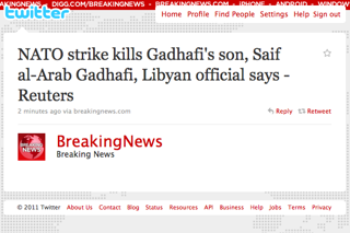 A senior Libyan official has confirmed to Reuters that Saif al-Arab Gaddafi, youngest son of Libyan dictator Muammar Gaddafi, has been killed in a NATO strike. Other reports from AP confirm that Gaddafi the elder was also in the home, as well as three grandchildren; however, he escaped injury.