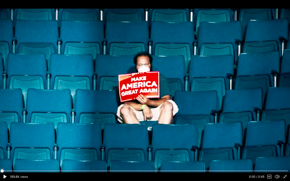 The Lincoln Project ad begins by showing a single Trump supporter, holding a MAGA sign alone in a sea of blue seats.