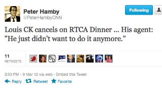 Comedian Louis C.K. has dropped out of hosting the Radio and Television Correspondents Association dinner, CNN political reporter Peter Hamby Tweeted Friday afternoon. Hamby quoted the comedian’s agent, noting that “He just didn’t want to do it anymore.”