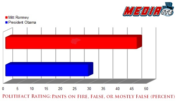 Even when Romney does tell the truth, according to Politifact, he’s much more likely to mix in some falsehoods. 48% of his non-false ratings were only “Half True,” compared with 35% for President Obama.