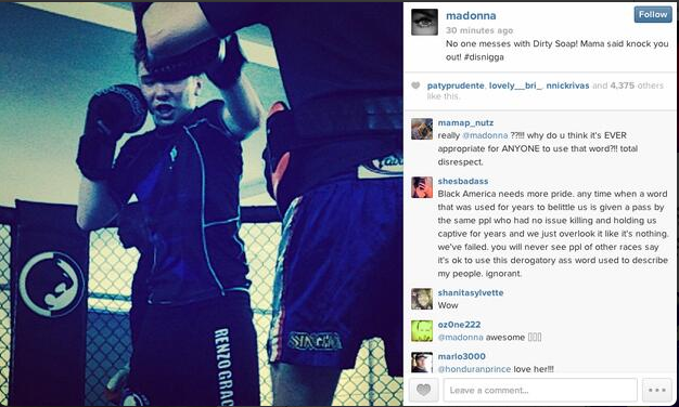 Madonna was forced to issue an apology to her more than 1 million Instagram followers Saturday after she posted a photo of her 13-year-old son Rocco Ritchie that included the hashtag #disn*gga (but without the asterisk). Along with the photo of her son boxing and the hashtag, the singer wrote, “No one messes with Dirty Soap! Mama said knock you out! #disnigga”