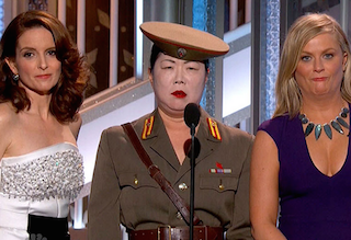 Throughout last night’s Golden Globe Awards, Margaret Cho appeared as the newest member of the Hollywood Foreign Press Association, North Korean General “Cho Young Ja.” The bit was just one way that hosts Tina Fey and Amy Poehler made last night’s award show all about the Sony Pictures hack.