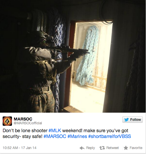 “Don’t be lone shooter #MLK weekend — make sure you’ve got security!” MARSOC posted to its Twitter and Facebook account, accompanied by a photo of a Marine standing at a window with a short-barrel rifle used for visit, board, search, and seizure operations: