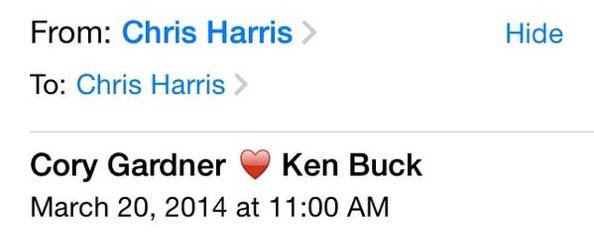 The Daily Beast caught the Senator’s email to reporters, which cast aspersions on his opponent, Republican congressman Cory Gardner, by negatively comparing him to his predecessor, right-wing extremist Ken Buck, via cute heart symbol:
