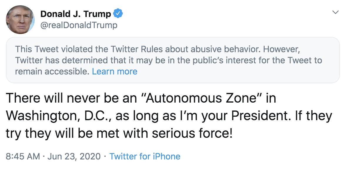 The platform has flagged three tweets of President Donald Trump: keeping his posts up but including a warning. On May 26, Twitter applied labels on two Trump tweets about mail-in voting, which promoted baseless and false claims about the risk of fraud. Three days later, the platform hid a Trump tweet because it “glorified violence.” Most recently, a tweet about Washington D.C. protesters violated rules of “abusive behavior.”