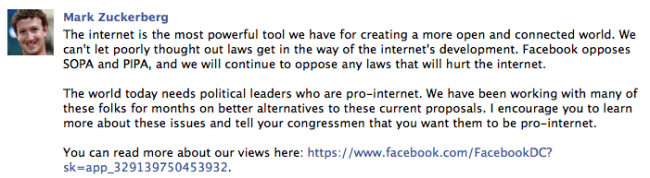 Facebook CEO Mark Zuckerberg posted a status update in opposition of anti-piracy bills SOPA and PIPA. “The internet is the most powerful tool we have for creating a more open and connected world. We can’t let poorly thought out laws get in the way of the internet’s development. Facebook opposes SOPA and PIPA, and we will continue to oppose any laws that will hurt the internet.”
