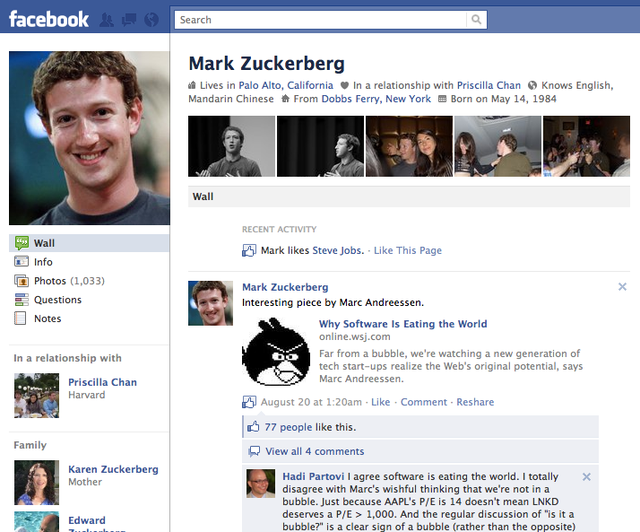 This is cute: Facebook’s Mark Zuckerberg has paid tribute to Steve Jobs as he knows best how to by ‘Like’-ing him on Facebook, of course. Because these days, the sound of a hero’s praise is something akin to the sound of a million ‘Likes’ being clicked. Zuck’s profile will from here on out forever salute Jobs — alongside “Brogramming” and “Lotus Thai Bistro” — as one of his very most ‘Like’-ed things.