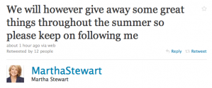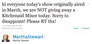 Of course, things could have been much worse than they ended up. Since the contest used Twitter as the means to apply, Stewart (or whoever runs her Twitter) was able to notice all of the mixer-related “@replies” she was getting relatively quickly and set the records straight with this tweet: