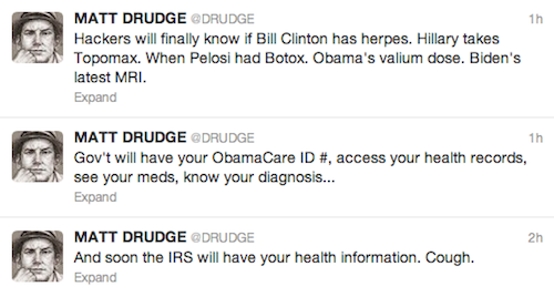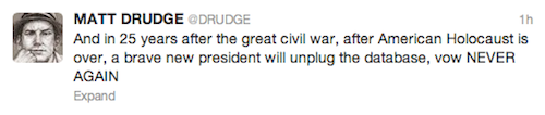 Amid the controversy over Uncle Sam singling out politically conservative groups, Matt Drudge took to Twitter on Monday morning to offer his take. Linking the IRS scandal to President Obama‘s health care law, the Drudge Report creator foreshadowed civil war, an “American Holocaust,” and a “brave new president.”
