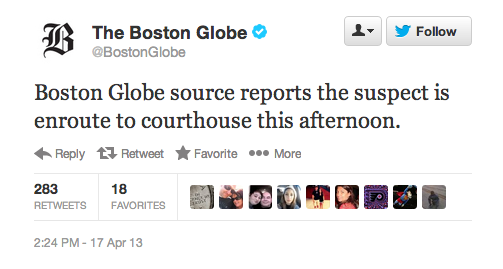 20 minutes later, The Boston Globe reported that sources told the paper a suspect was in custody and en route to a Boston courthouse: