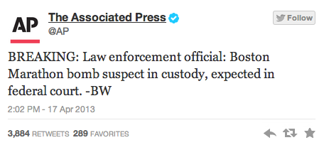 Shortly after 2:00 p.m. ET, the Associated Press reported that the Boston Marathon bomb suspect was in custody and expected in federal court: