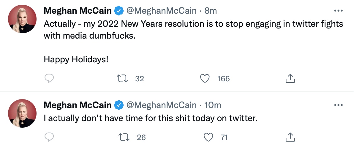 “Actually — my 2022 New Years resolution is to stop engaging in twitter fights with media dumbfucks,” she went on. “Happy Holidays!