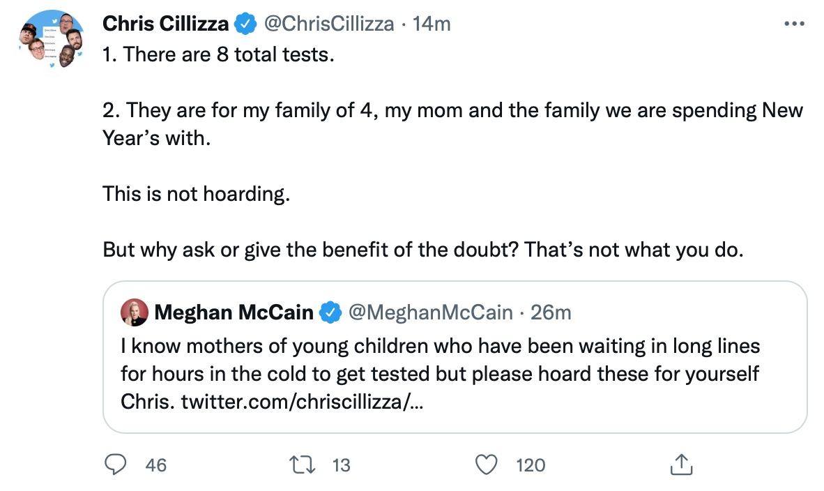Cillizza wound up getting attacked by a number of critics who mocked his cautious response to Covid. Some detractors, including McCain, accused Cillizza of being a test hoarder. In response, Cillizza explained the tests he bought were for his family.