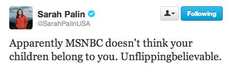 The MSNBC host took her fair share of persecution for what some conservatives are viewing as a threat on their rights to control their own children. Glenn Beck called the promo “almost a parody of reality.” Rush Limbaugh called her views “Marxist.” And in a tweet of her own, Sarah Palin demonstrated her unique brand of outrage: