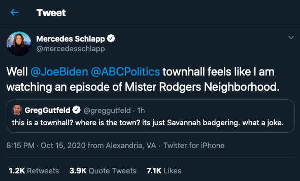 Schlapp quoted Gutfeld’s tweet and then added her own comparison of the Biden town hall, saying it “feels like I am watching an episode of Mister Rodgers Neighborhood.”