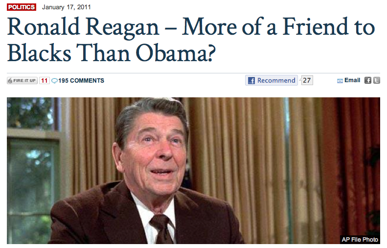 There’s nothing really offensive in the article itself. In fact, it’s a rather nice ode to the man’s father. Sure, Reagan brings up the dubious claim that his father was the real first black president only to shoot it down as something that would “diminish the justifiable pride African-Americans take in having a president who is genetically and culturally black” (Reagan realizes he doesn’t exactly have the leeway a Toni Morrison would in this situation), but it’s still odd to have the idea even floated today. And it’s even stranger to click on Fox Nation and see a giant picture of Ronald Reagan and the headline “Ronald Reagan – More of a Friend to Blacks Than Obama?” as the top story. As a Reddit user said, it’s just not that “classy.”