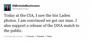 Congresswoman Michele Bachmann, a member of the U.S. House Intelligence Committee, was among those who were granted access to the CIA’s photos of Osama bin Laden‘s corpse taken both immediately after he was shot and killed by Navy SEALs and before his burial at sea.