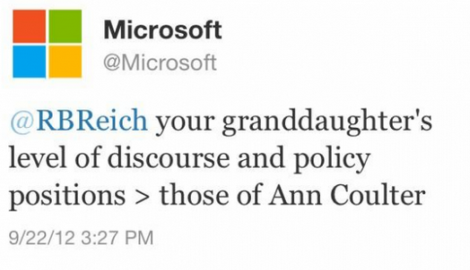 Microsoft’s account tweeted a message at Coulter’s fellow panel guest and former Labor Secretary for President Bill Clinton, Robert Reich, attacking Coulter for her level of discourse.