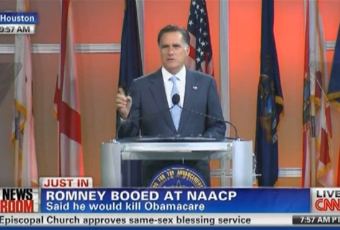 During his Wednesday morning speech before the NAACP Convention in Houston, Texas, Republican presidential candidate Mitt Romney explained that his plans include reducing government spending by eliminating “every nonessential expensive program I can find, and that includes ObamaCare.” Although several other Romney policy proposals were met with applause, the health-care remark was met with significant booing.