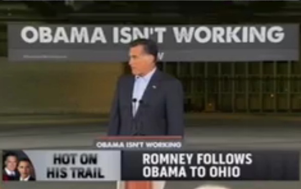 Presumptive Republican presidential nominee Mitt Romney rolled out a new accessory at a speech in Ohio today, delivering his remarks in front of a black banner that said “Obama Isn’t Working,” which is also the name of a website his campaign set up several months ago (in case you didn’t get the message from the banner, it was also on the front of Romney’s podium).