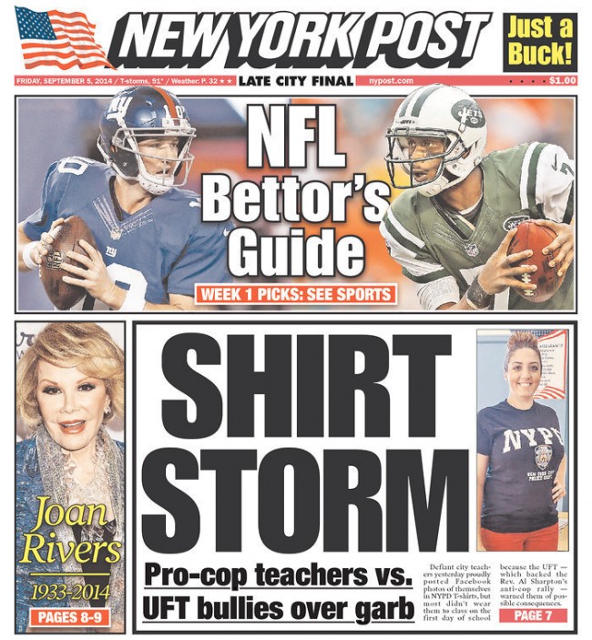 The New York Post generally goes for splashy tabloid covers, so it surprised people that their cover yesterday did not go all-out with a Joan Rivers tribute: