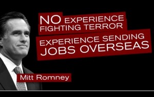 The narration, “Mitt Romney may have no experience fighting terror but he does have some experience with foreign countries – sending our jobs to them,” is then accompanied by a stark graphic that reads, “No experience fighting terror.”
