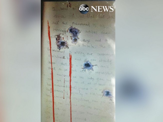 “The U.S. government is killing our innocent civilians, but most of you already know that… I can’t stand to see such [bullet hole] go unpunished. We Muslims are one body. You kill one of us, you hurt [bullet hole] us all.”