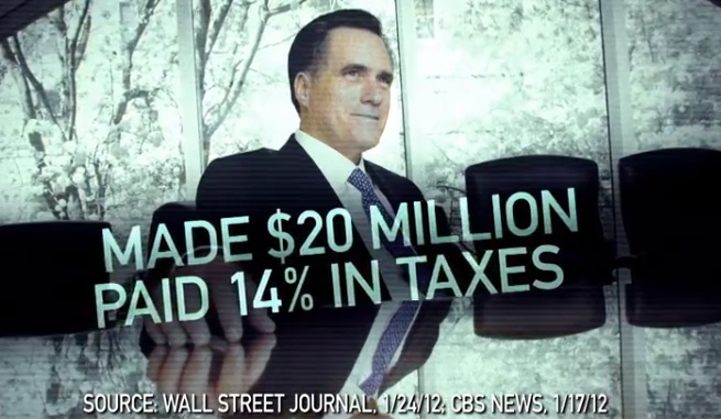 Over a classic negative ad color-drained still, the narrator continues, “Mitt Romney made twenty million dollars in two thousand ten but paid only fourteen percent in taxes…probably less than you.”