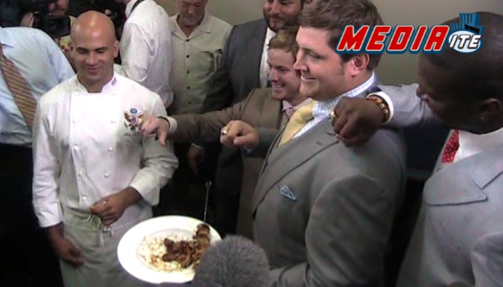 Today, the White House Briefing Room became the White House Striefing Room. Saints Offensive tackle Zack Strief, kicker Garrett Hartley, center Nick Leckey, defensive end Bobby McCray, and White House chef Sam Kass presented their dish to a crush of reporters in the Brady Briefing Room. The visit took the press by surprise, but they rushed into the briefing room like they were putting out a fire.