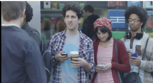 In the commercial, Apple fans in big cities full of obnoxious people are lining up for, presumably, the very latest iPhone. They are prepared to wait for hours and hours if that’s what it takes; it don’t matter what state their Uniqlo jeans are in after. Then, they spot a couple of nice-looking people using… Gasp! Samsung phones!