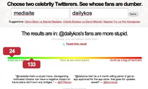 Mashable, the social media blog, is reporting that a new app for Twitter will allow users to compare the fans of different celebrities and see which group is “stupider”. Stupid Fight was created by Tom Scott, a designer who also created the equally mischievous Tweleted, and will probably cause anyone who uses it to become completely addicted…for at least a few hours. Of course, in a world where complex thoughts are broken down to fit into 140 characters, a few hours is nearly a lifetime.