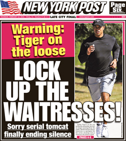 The collective conscience of the New York City tabloid editorial departments are at work this morning. After news broke yesterday that Tiger Woods would be giving his first press conference (coffee klatch conference?) tomorrow, everyone wants to lock Tiger Woods up! Tiger on the loose, etc.