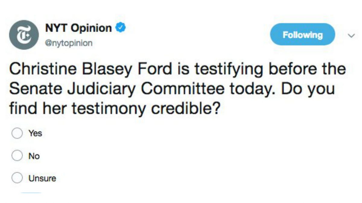 The New York Times opinion page’s Twitter feed posted, then deleted, a poll asking people whether they found Christine Blasey Ford‘s testimony “credible” after the first part of today’s Senate Judiciary Committee hearing.
