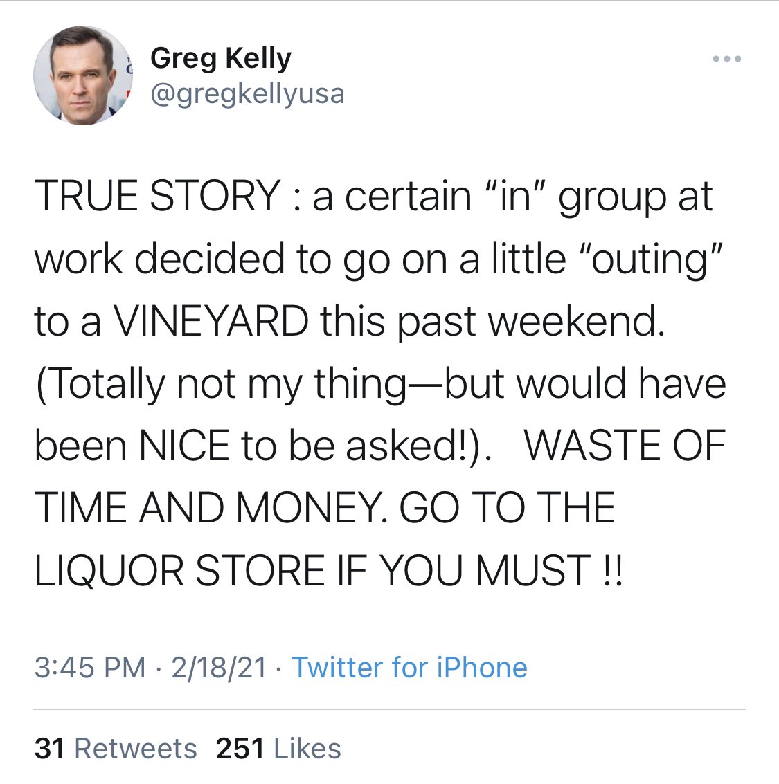 Newsmax TV host Greg Kelly deleted a tweet on Thursday afternoon, shortly after posting the message to his over quarter of a million followers, in which he fumed over what appears to be workplace drama at the cable channel. More specifically, he expressed grievances that an “in-group” at Newsmax didn’t invite him on a recent vineyard excursion.