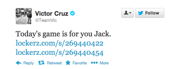 NFL player Victor Cruz, wide receiver for the New York Giants, plans to honor 6-year-old shooting victim Jack Pinto by wearing the boy’s name on his cleats and gloves during Sunday’s game. Pinto was a fan of both the Giants and Cruz and after learning this, Cruz reached out to Pinto’s family to offer his condolences.